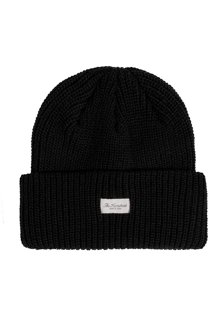 - The Hundreds Rich woven label sewn on front of beanie fold